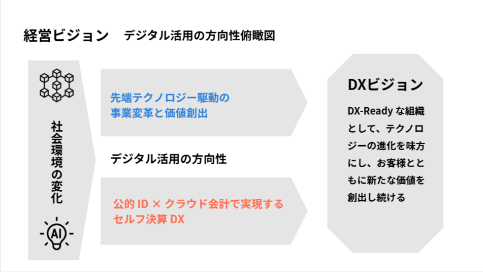 しかし当社はこの変化を脅威ではなく機会と捉え、「DX-Ready な組織として、テクノロジーの進化を味方にし、お客様とともに新たな価値を創出し続ける」という DX ビジョンを掲げます。